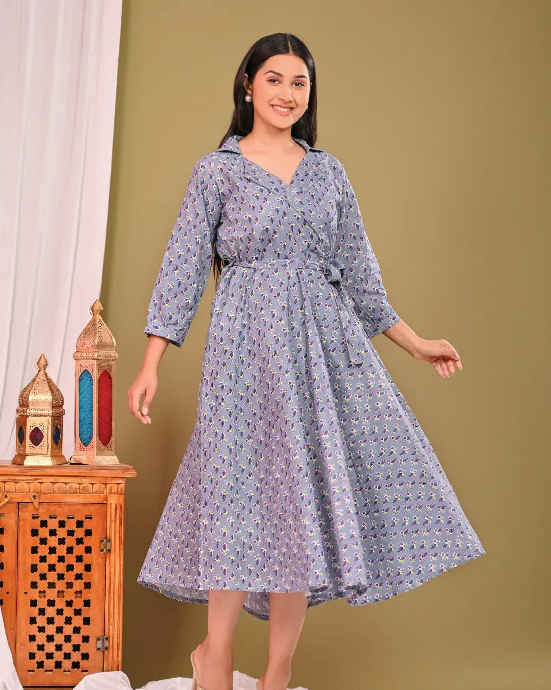 • The Women's Dress: Showcases an A-line or umbrella-cut midi-length silhouette with a V-neck, 3/4 sleeves, and is often designed with a tie-up waist belt and convenient side pockets for added functionality.
