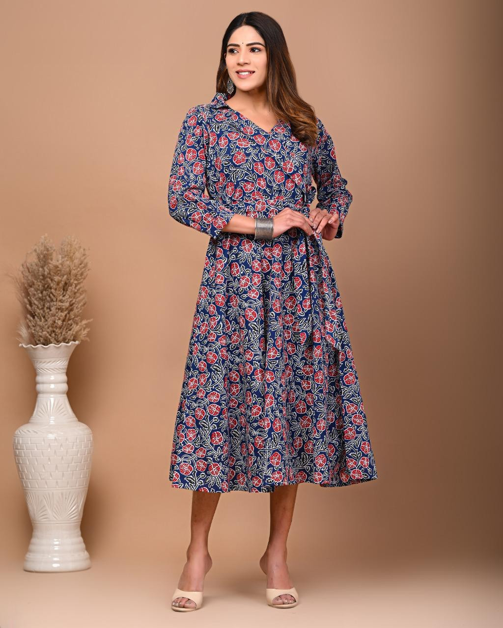 The garments showcase the meticulous technique of hand block printing, where skilled artisans use carved wooden blocks to stamp intricate floral and geometric patterns onto the fabric. This manual process ensures each piece is unique, with rich motifs in red and blue that provide a dynamic visual appeal.