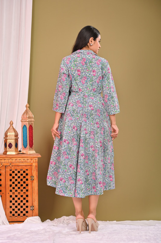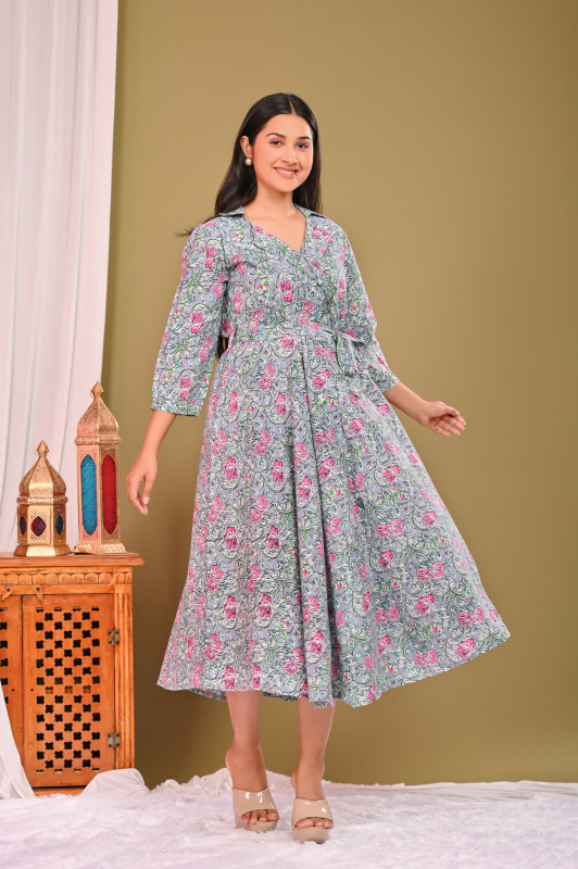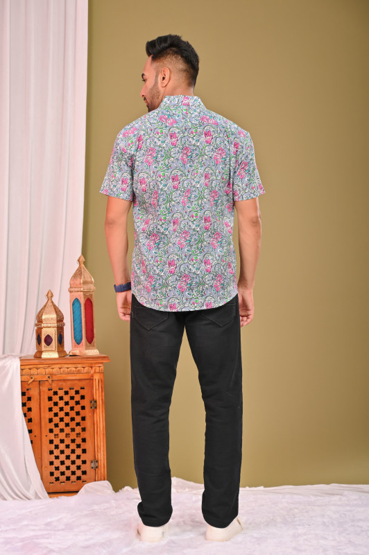 This chic and coordinated ensemble for couples is crafted from premium quality cambric cotton, renowned for its soft texture and breathability, making it comfortable for all-day wear. The fabric features a delicate yet vibrant grey and pink floral print, typically applied using the traditional hand block printing technique, which lends a unique, artisanal touch to each garment. The woman's outfit is a stylish A-line midi dress with a flattering V-neck and 3/4 sleeves, while the man's is a casual half-sleeve button-down shirt with a classic collar; both pieces perfectly complement each other to create a harmonious and fashionable 'twinning' look that is versatile for various casual and semi-formal occasions