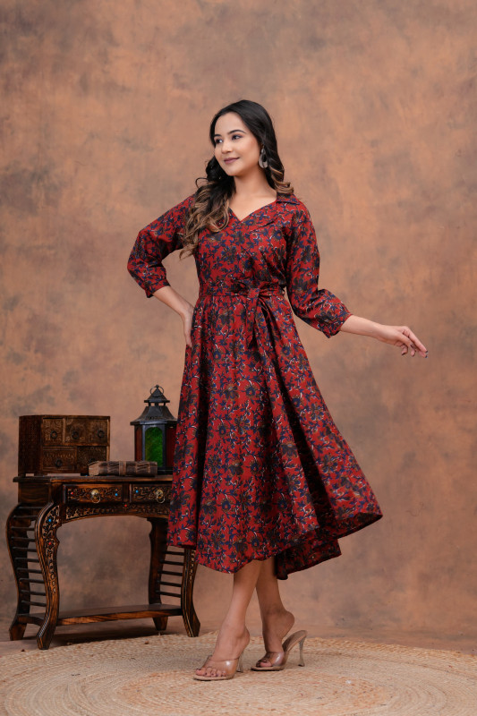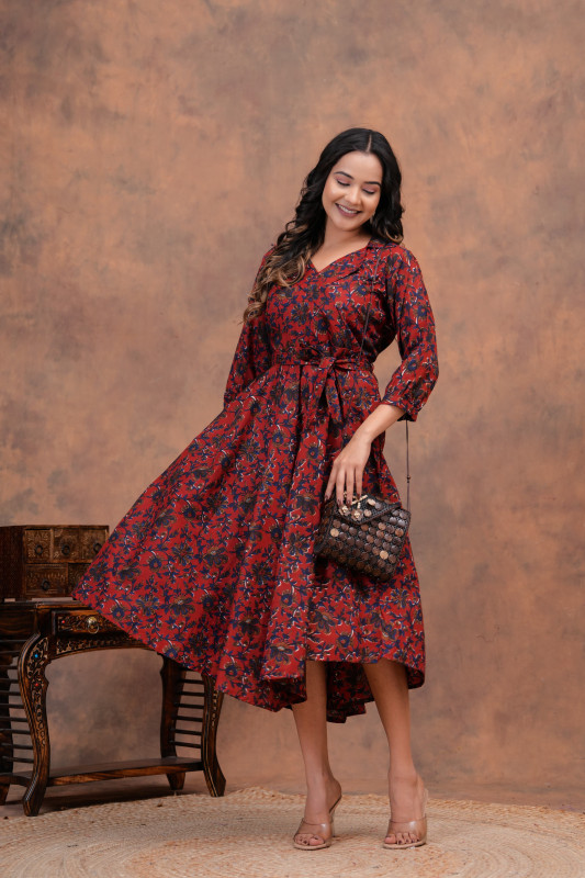 - Design & Pattern: The outfits feature intricate floral and leafy motifs in a deep red and black color palette. The pattern is often applied using the traditional Indian technique of hand block printing, a process that highlights artisanal skill and results in unique designs.