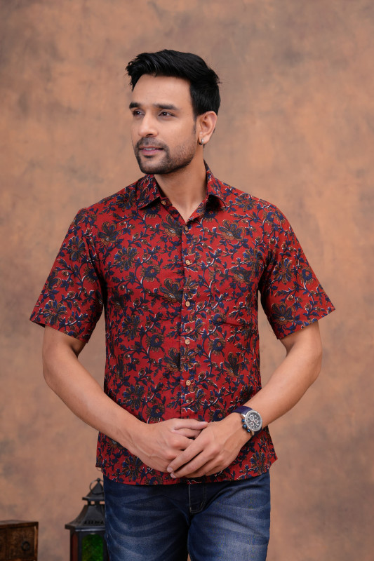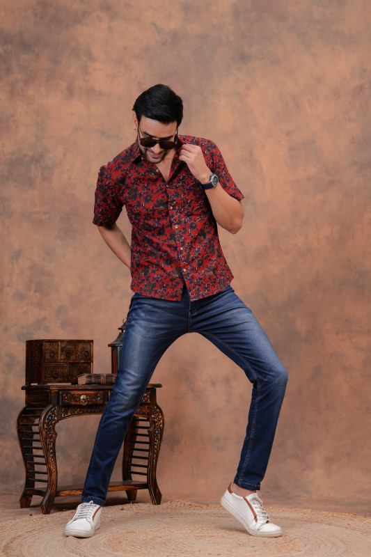 This exquisite matching couple's set is crafted from soft, breathable cotton fabric, featuring a striking red and black floral print design. It offers a harmonious blend of traditional Indian textile artistry and contemporary casual fashion, perfect for a coordinated and stylish appearance.
