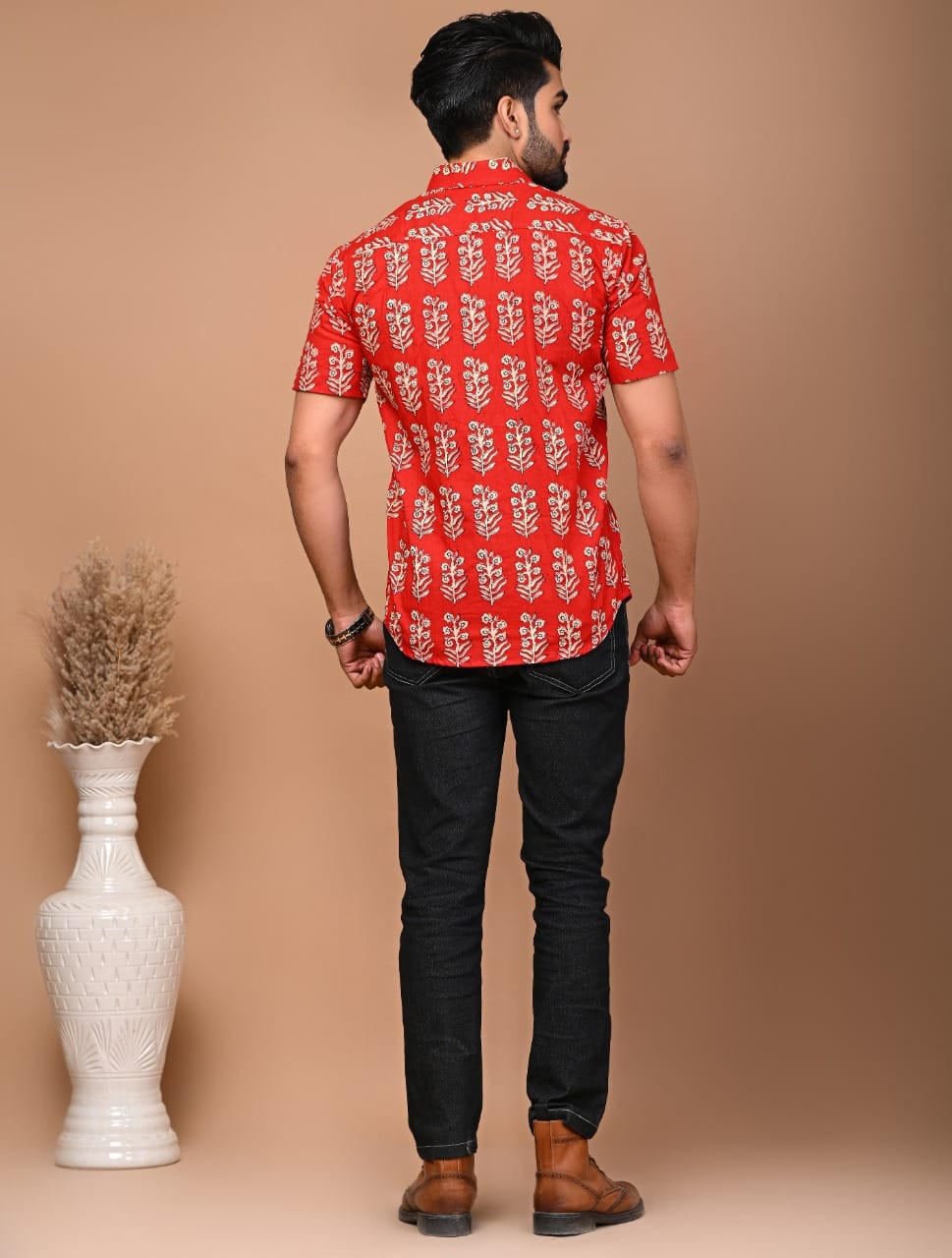 A matching couple's outfit in a red and off-white traditional hand block print design, made from a cotton material