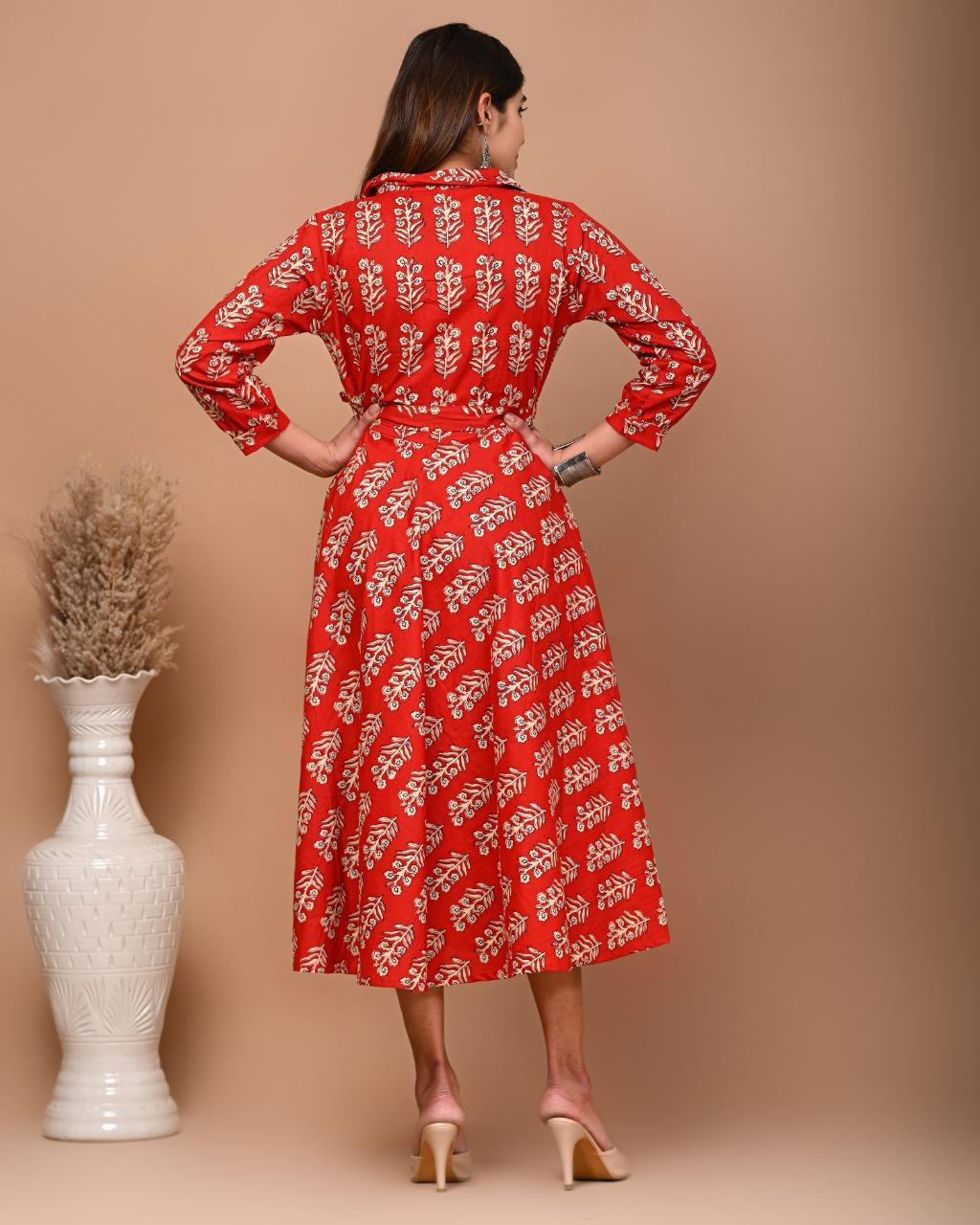 • Design & Pattern: The outfits feature intricate floral and geometric motifs in a vibrant red and off-white color palette. The pattern is applied using the traditional Indian technique of hand block printing, a process that highlights artisanal skill and results in unique designs.