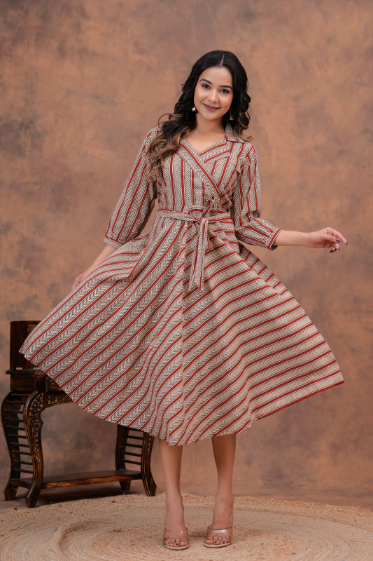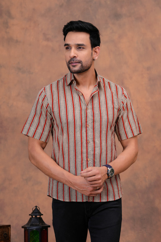 This stylish and coordinated couple's ensemble features a dynamic red, off-white, and black striped print design, crafted from a breathable cotton material. The outfit offers a contemporary aesthetic that is perfect for a variety of casual and semi-formal occasions. The fabric is lightweight and comfortable, often utilizing traditional hand block printing techniques to achieve the unique pattern. The woman's outfit is a chic A-line midi wrap dress with a V-neck, 3/4 sleeves, and a tie-up waist belt that flatters the silhouette, while the man's is a casual, short-sleeve button-down shirt with a classic collar and regular fit. This matching set is versatile for various casual occasions, from beach outings to daytime events, and creates a perfectly synchronized look for the couple
