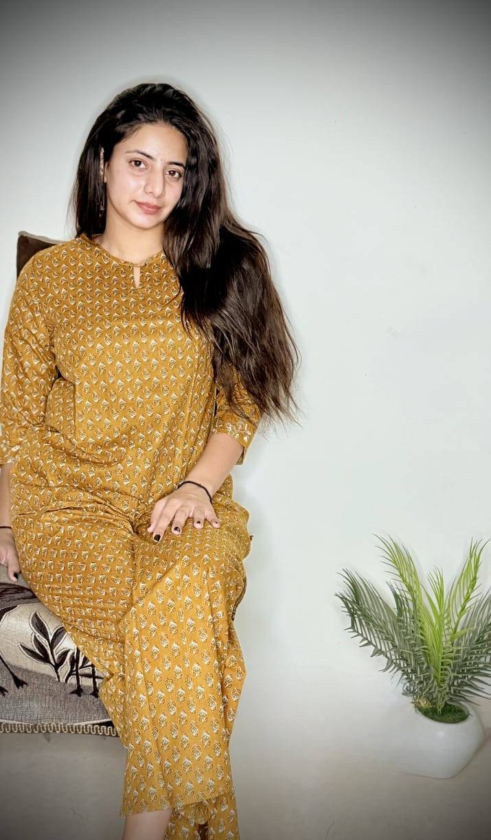 Embrace a warm and sophisticated aesthetic with our Amber Earth Ethnic Co-ord Set. Featuring a rich mustard-yellow hue adorned with intricate hand-block style patterns, this set is designed for the modern woman who values both tradition and comfort. Made from high-quality, breathable cotton, it’s an ideal choice for work-from-home days, casual outings, or festive gatherings.