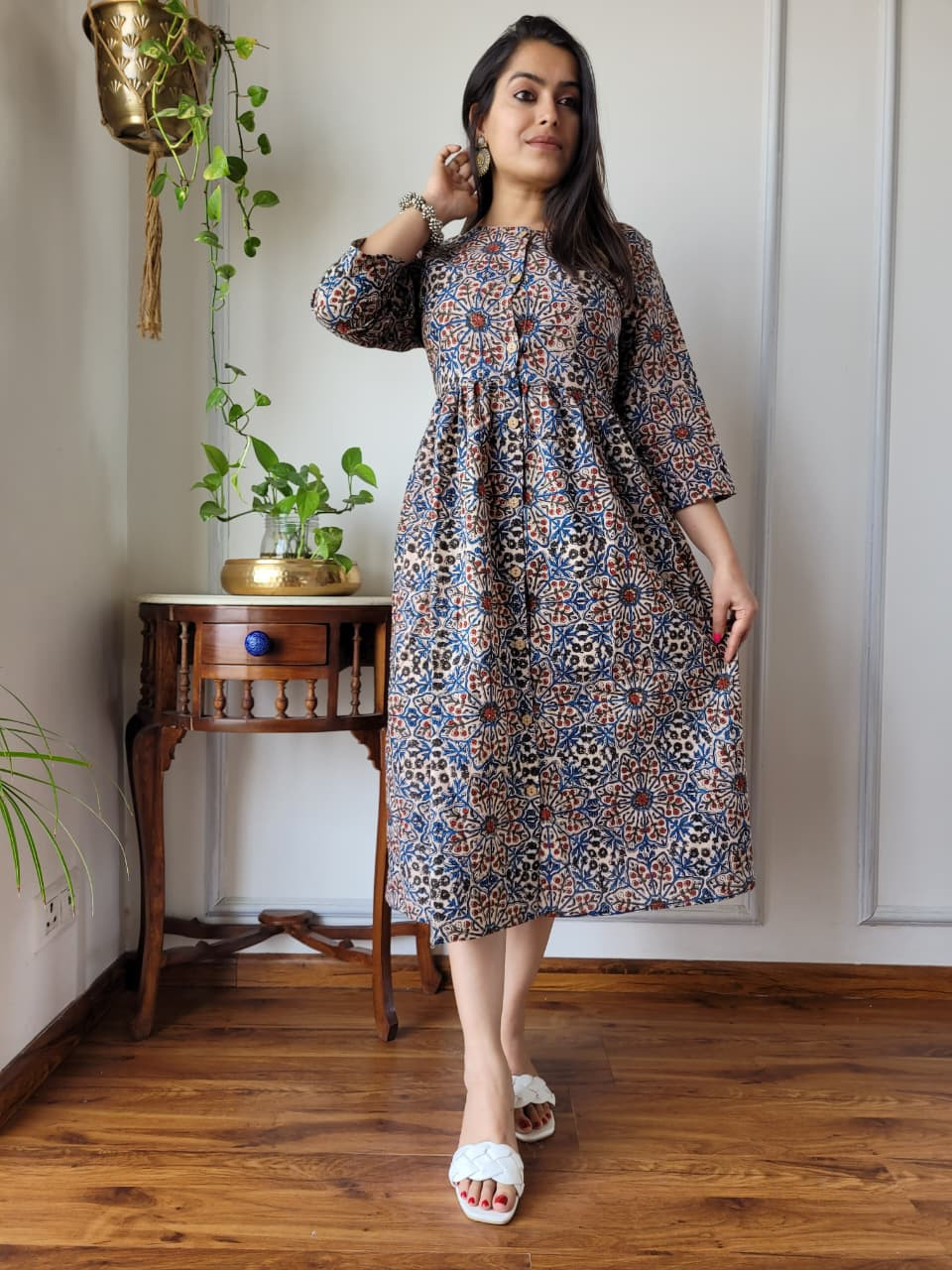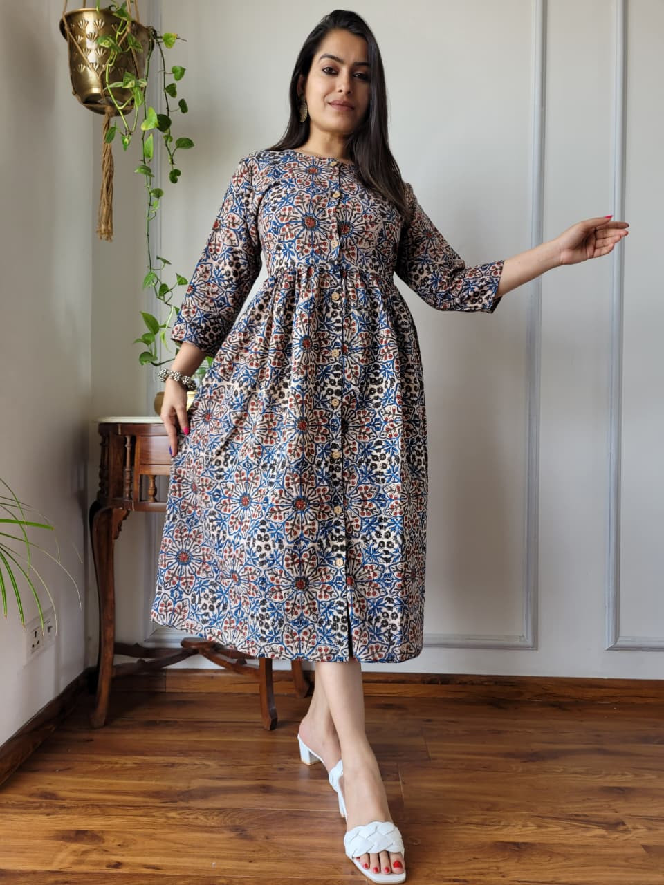 The dress features a neutral beige or off-white base color adorned with intricate floral and abstract motifs in contrasting shades of rust red and blue. These patterns are created using the time-honored hand block printing technique, where skilled artisans in regions like Rajasthan use hand-carved wooden blocks and natural dyes to stamp the fabric. This process ensures each piece is unique and carries significant cultural heritage.