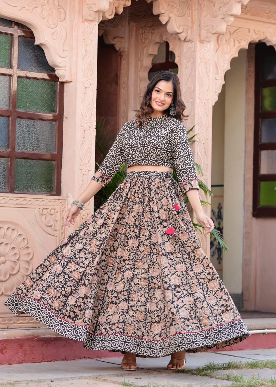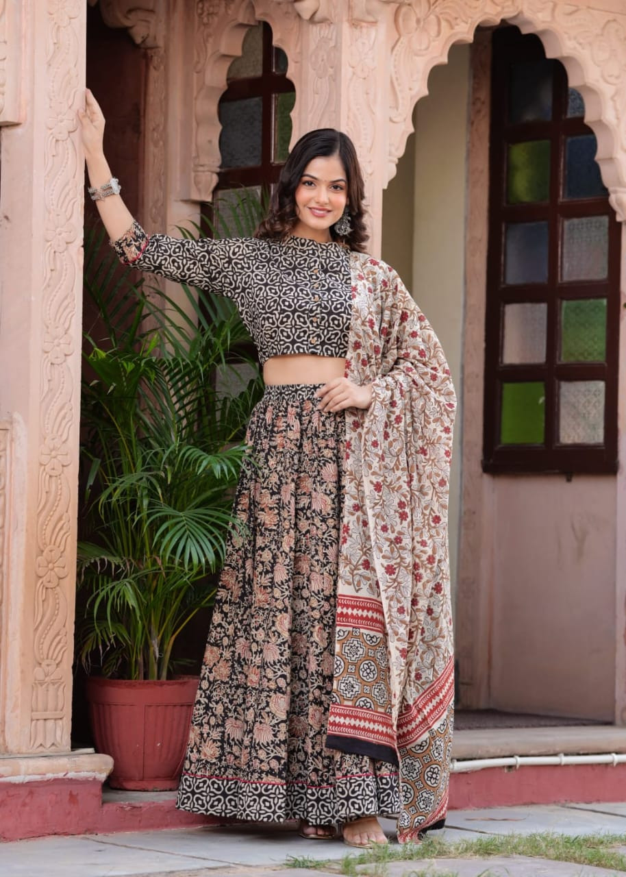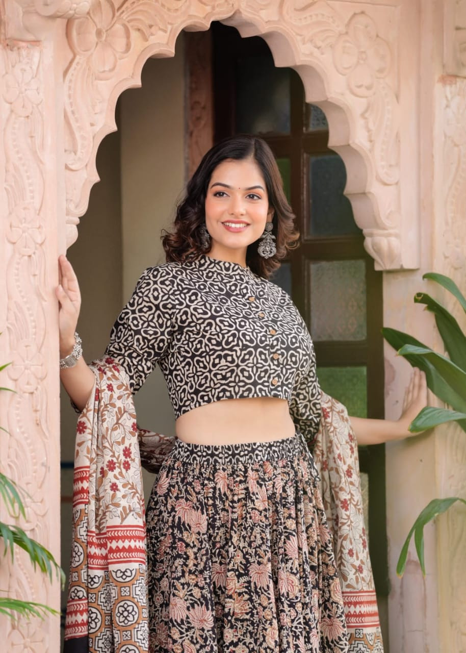 This sophisticated ethnic ensemble is made from premium cotton fabric featuring intricate Kalamkari inspired floral and vine patterns in earthy cream and reddish tones over a deep black base. The outfit includes a button-down crop top choli with a mandarin collar that measures 15 to 16 inches in length and is available in a size range from 36 to 46 (S to 3XL). The coordinating lehenga skirt is 40 inches long and is crafted with 28 kalis to provide a massive 5.5-meter flair for a grand traditional look. To complete the set, it comes with a 2.5-meter cream-based dupatta adorned with matching floral prints and a dark patterned border. This breathable and elegant set is an ideal choice for cultural events, festive celebrations, or any formal occasion where you want to showcase classic Indian print artistry with a voluminous silhouette.