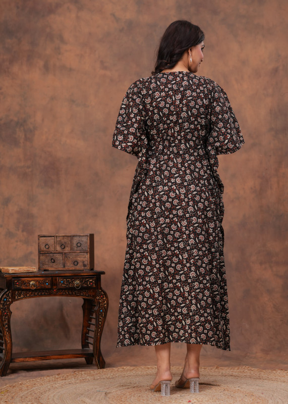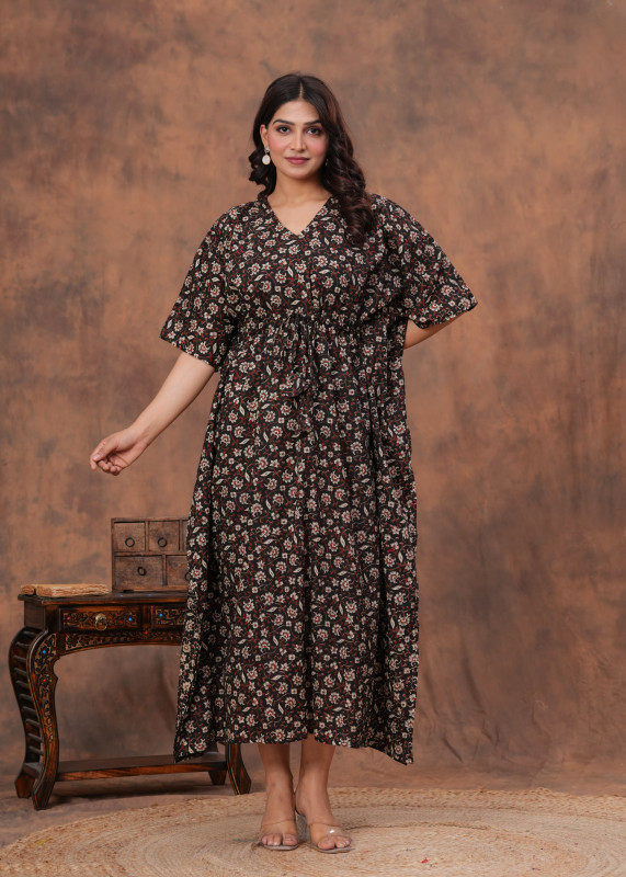 This stylish kaftan is commonly made from a soft, breathable 100% cotton fabric, which provides comfort for all-day wear. It features a loose, flowing silhouette with a V-neckline and wide, short kaftan sleeves. The kaftan has an adjustable drawstring waist to allow the wearer to customize the fit to their body shape. The deep black base is decorated with intricate floral and leaf patterns in contrasting colors like red, maroon, and beige, giving it an elegant and dramatic look. This versatile piece is ideal for various occasions, functioning well as casual wear, loungewear, or even as comfortable nightwear.