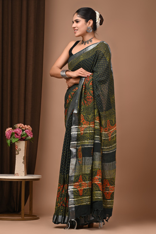 Woven from premium-quality linen fabric, the saree offers a perfect balance of comfort and sophistication. Its breathable texture makes it ideal for both everyday elegance and special occasions, ensuring you stay effortlessly stylish throughout the day. The rich black base beautifully highlights the multicolored hand block motifs, adding depth, vibrancy, and an artisanal charm to the overall drape.
