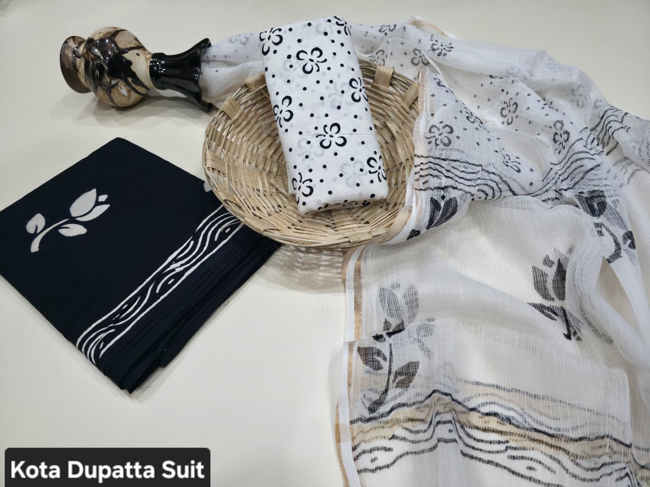 This unstitched cotton suit set is identified as a Black & White Cotton Kota Doria Dupatta Suit or a Cotton Suit with Kota Doria Dupatta.