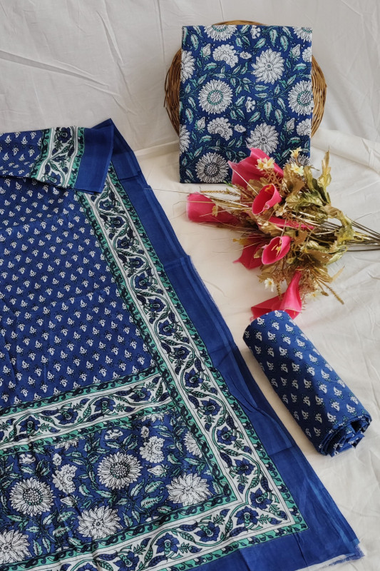 This suit set is a beautiful ensemble featuring blue and white floral and paisley patterns printed on soft cotton fabric. The set includes a 2.5-meter top, a 2.5-meter bottom, and a 2.5-meter dupatta, all unstitched, allowing for a custom fit. The combination of floral and paisley motifs creates a visually appealing design, perfect for various occasions. The breathable cotton material ensures comfort, making this set a versatile addition to any wardrobe.
