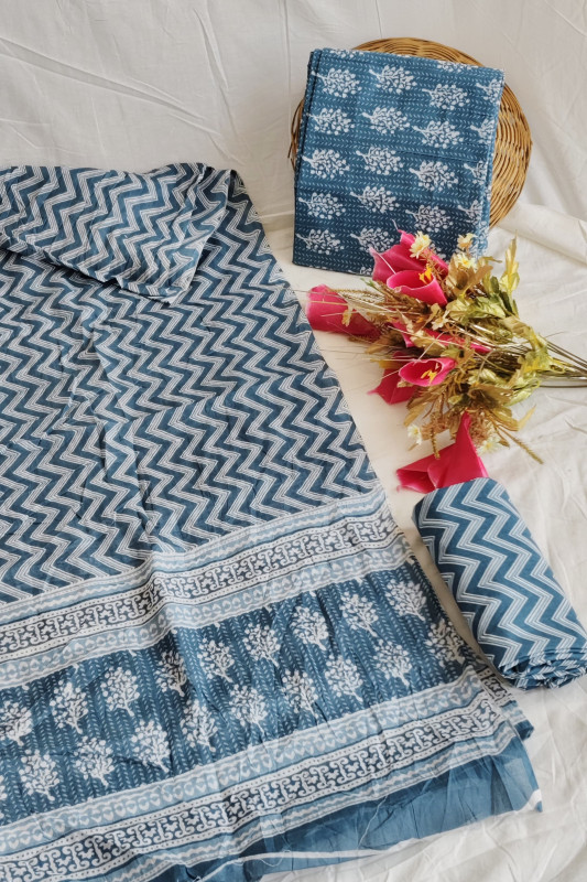 This unstitched women's suit set, sourced as pure cotton fabric, showcases a captivating blend of traditional Indian craftsmanship and modern design. Utilizing time-honored hand block printing techniques, the material features a rich blue base color. The ensemble is distinctly patterned with a sharp chevron motif on the top and bottom fabrics for a contemporary appeal, complemented by a graceful dupatta adorned with intricate white floral patterns.