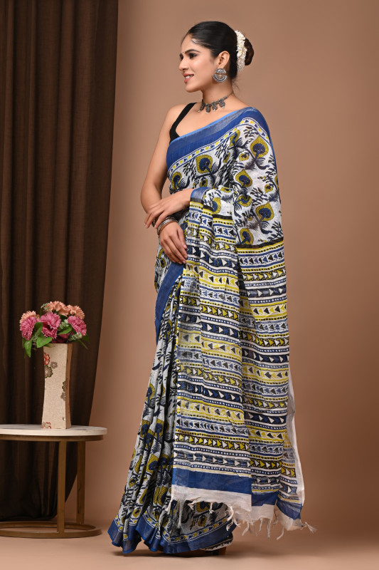 Embrace the charm of traditional Indian craftsmanship with this stunning Blue & Yellow Hand Block Peacock Feather Print Linen Saree. Designed for women who appreciate elegance, comfort, and culture, this saree beautifully blends artistic heritage with modern styling.
