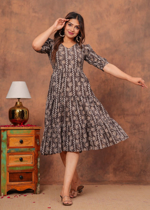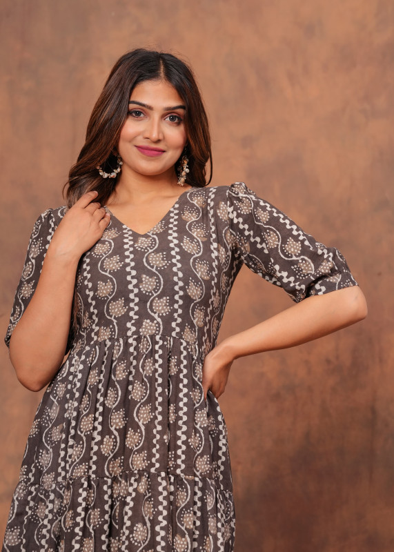 Update your wardrobe with this earthy brown midi dress featuring a unique vertical pattern of wavy lines and floral motifs in beige tones. The dress offers a flattering V-neckline and comfortable half sleeves that lead into a gathered waist and a voluminous tiered skirt. Ideal for casual wear or weekend gatherings this stylish one-piece provides a relaxed fit and pairs perfectly with heels or sandals for a complete look.