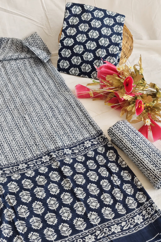 This dark blue and silver hand cotton unstitched suit material for women offers a sophisticated blend of elegance and comfort, designed to be customized to your precise preferences and measurements. Crafted from pure cotton with a distinctive hand-printed design in dark blue and a silvery white hue, the fabric is breathable, soft, and ideal for all-day wear. The set includes a generous 2.5 meters of material each for the top, bottom, and dupatta, providing ample fabric to fashion a variety of ethnic outfits, from a traditional salwar kameez to a modern kurti with palazzo pants. The intricate hand-printed pattern in this elegant color combination adds a traditional yet chic aesthetic, making this material a versatile choice for both casual outings and special occasions.