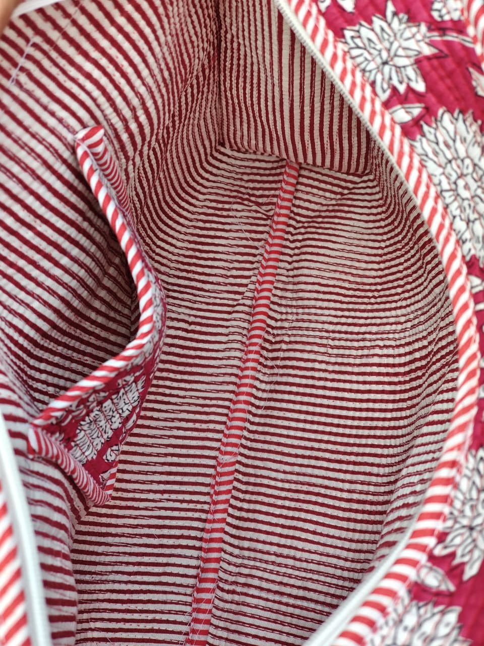 Lightweight yet sturdy, the bag weighs approximately 400 grams, making it easy to carry throughout the day without feeling bulky. With an approximate size of 18 x 18 inches, it offers ample storage space while maintaining a sleek profile. Designed for effortless care, this tote bag is both hand and machine washable, ensuring long-lasting freshness and usability. The Indigo Bloom Floral Cotton Quilted Tote Bag is a perfect choice for those who appreciate classic prints, eco-friendly materials, and functional handcrafted accessories.