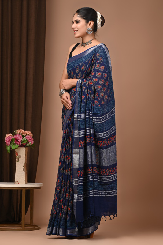 This exquisite Indigo Blue Hand Block Printed Linen Saree with a Silver Border offers a perfect blend of traditional craftsmanship and contemporary style. Crafted from premium, lightweight linen fabric, this saree is designed for comfort and elegance. The body features intricate, handcrafted hand block prints in striking red and white motifs set against a deep indigo blue background. A shimmering silver zari border runs along the edges, adding a touch of sophistication and contrast. The matching pallu showcases a distinct striped and patterned design, completing this elegant ensemble suitable for both casual gatherings and formal events.