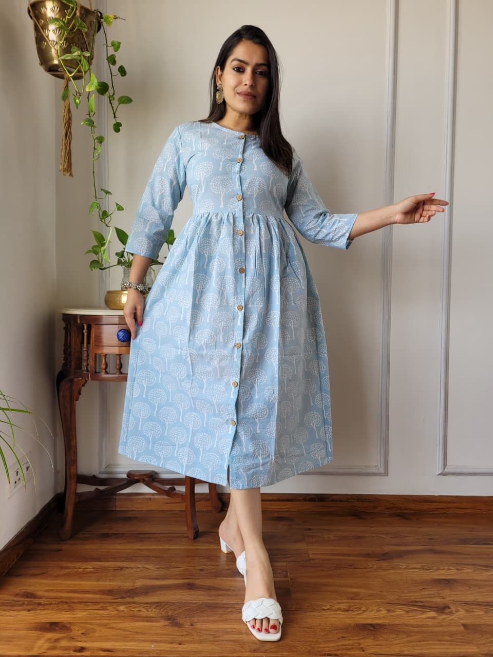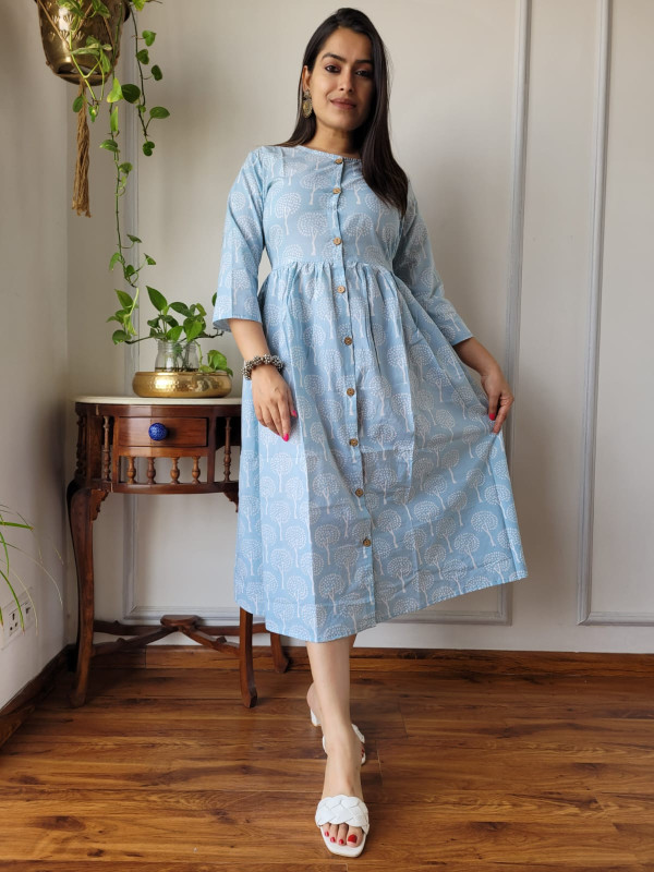 The dress features a soothing light blue base color adorned with intricate white (or off-white) motifs, which often resemble trees or abstract florals, created using the time-honored hand block printing technique. This traditional artisan process from regions like Bagru in Rajasthan involves skilled craftspeople using hand-carved wooden blocks to stamp patterns onto the fabric, ensuring that each piece is unique and carries cultural heritage.