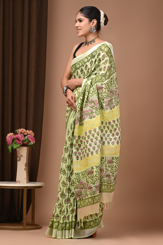 The saree is richly adorned with intricate Hand Block Prints featuring diverse Floral Motifs in a pleasing palette of Pink, Green, and Yellow. The multi-colored block prints create a fresh, garden-like appeal, contrasting beautifully with the pale base color. The hand-printing technique lends an authentic, artistic touch to the entire garment.
