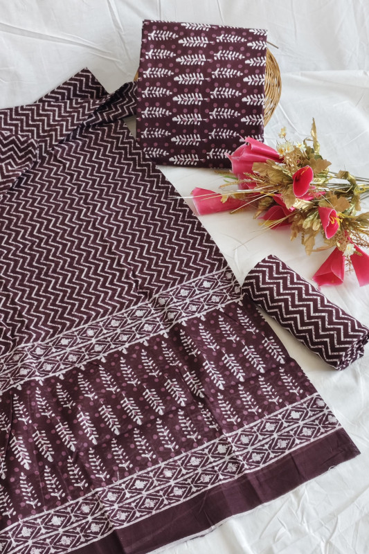 Embrace artisanal luxury with this exquisite maroon Dabu hand block printed cotton unstitched suit material. Crafted in the traditional mud-resist Dabu technique, a cherished heritage art form of Rajasthan, India, each piece features a blend of intricate botanical and geometric patterns that are as unique as they are elegant. The rich, earthy maroon and white hues are achieved using natural, eco-friendly dyes, adding to the sustainable charm of this set. Made from premium 100% pure cotton, this dress material promises exceptional breathability and comfort, making it perfect for year-round elegance. The versatile unstitched format allows for complete creative freedom to design a custom-fit ensemble, such as a timeless salwar kameez or a chic palazzo suit.