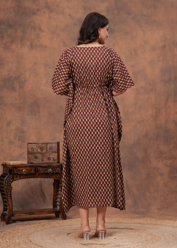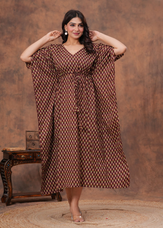 This stylish kaftan is generally made from 100% pure cotton for comfort and breathability. It features an all-over traditional Indian pattern, often described as a hand block or Bagru print, in colors like green and yellow against a rich maroon or brown base. The kaftan has a flattering V-neckline and a relaxed, free-size silhouette with an adjustable drawstring waist for a customizable fit. This versatile and comfortable piece is suitable for various occasions, including casual wear, beach or pool parties, vacation outfits, or even as loungewear/nightwear.