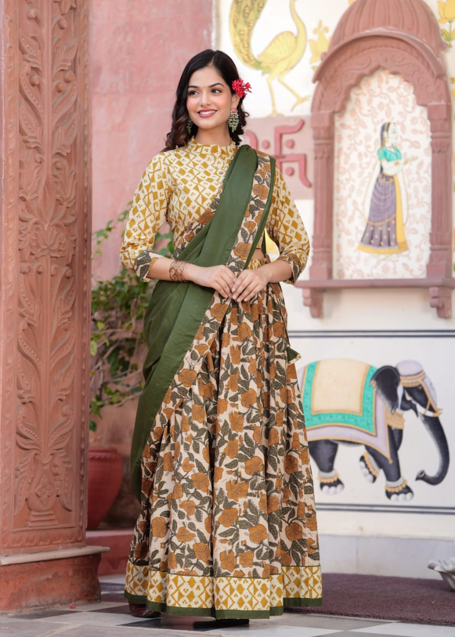 This traditional ethnic ensemble is crafted from high-quality cotton fabric featuring a mix of geometric patterns on the choli and large floral motifs on the skirt. The set includes a button-down crop top with a mandarin collar that measures 15 to 16 inches in length and is available in sizes 36 to 46 ranging from S to 3XL. The lehenga skirt reaches a length of 40 inches and is constructed with 28 kalis to provide a massive 5.5-meter flair for a grand look. To balance the intricate mustard and tan prints, the outfit is paired with a 2.5-meter solid olive green dupatta that features a printed border matching the lehenga. This breathable and stylish set is an ideal choice for festive celebrations or traditional events where comfort and elegance are equally important.
