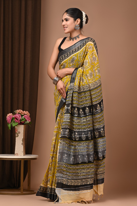 This elegant Mustard Yellow Handblock Printed Cotton Saree with Black & White Floral Pattern beautifully blends traditional artistry with contemporary charm, making it a perfect choice for everyday wear as well as festive occasions. Crafted from soft and breathable pure cotton, the saree features intricate handblock floral motifs across the body, complemented by a contrasting black border that enhances its visual appeal. The pallu showcases detailed black and white ethnic patterns, adding depth and richness to the overall design. Lightweight, comfortable, and effortlessly graceful, this saree drapes beautifully and pairs well with oxidized jewelry for a refined, timeless look.