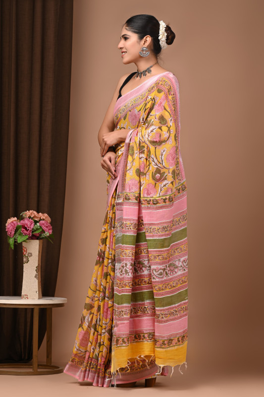 Immerse yourself in timeless elegance with this Mustard Yellow Handblock Printed Cotton Saree, beautifully crafted for women who appreciate heritage artistry and effortless style. Handcrafted by skilled artisans, the saree features delicate pink floral block prints that add a soft, feminine charm against the rich mustard base. The lightweight, breathable cotton fabric ensures exceptional comfort, making it perfect for daily wear, festive gatherings, or casual outings.