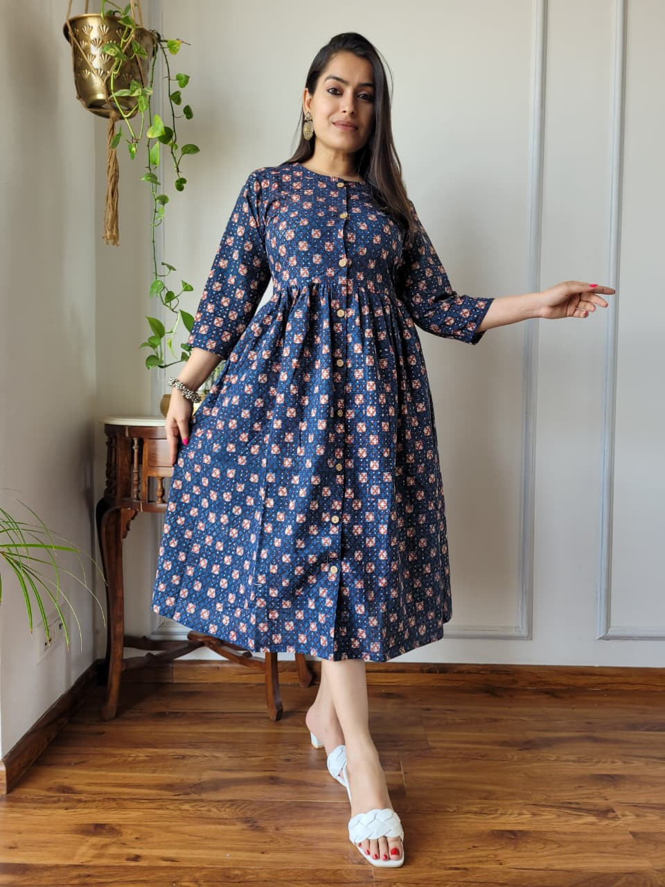 This navy blue and pink/white floral print cotton A-line dress is an elegant and comfortable garment that effortlessly blends a classic color palette with a modern, flattering silhouette. Crafted from high-quality, breathable cotton cambric fabric, it offers a soft, lightweight feel, ensuring maximum comfort for all-day wear. The dress features a deep navy blue base color adorned with intricate small floral motifs in shades of pink and white. These patterns are often applied using traditional hand block printing techniques, giving the garment an authentic, artisanal touch. The design follows a flattering A-line silhouette, fitted at the bodice and flaring out gently toward the hem, providing graceful movement and a relaxed fit. Key design details include a classic round neckline, a functional partial front button placket closure, and three-quarter length sleeves.