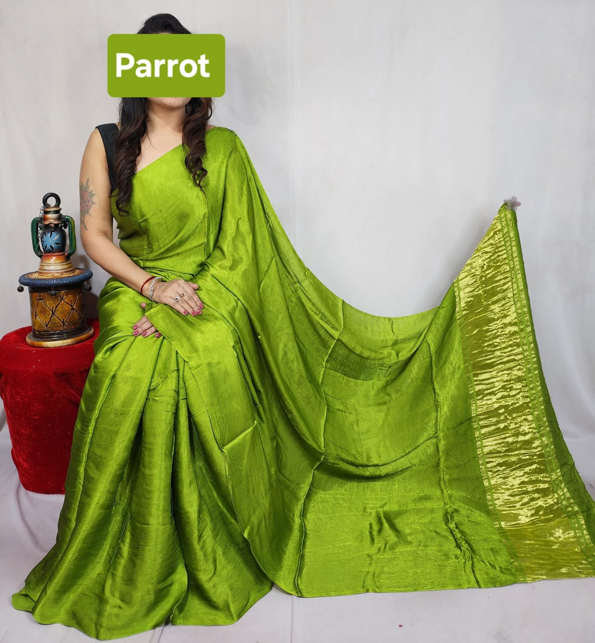 This stunning saree is crafted from premium Satin Silk, offering an exceptionally smooth, liquid-like drape and a high-gloss finish that captures the light with every movement. The lively Parrot Green shade provides a refreshing and energetic aesthetic, making it the perfect choice for weddings, traditional ceremonies, or high-spirited festive celebrations. Defining the look is an Elegant Golden Zari Border featuring a broad, textured design that adds a layer of royal opulence to the sleek, solid-toned body.