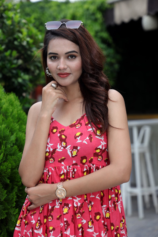 : Brighten up your summer wardrobe with this lively pink midi dress featuring a playful floral print in yellow and maroon tones. The sleeveless design offers a V-neckline with delicate spaghetti straps and a gathered empire waist that creates a flattering and voluminous A-line silhouette. Perfect for casual outings and warm days this comfortable one-piece combines vibrant style with ease making it a great choice when paired with simple sandals or heels.
