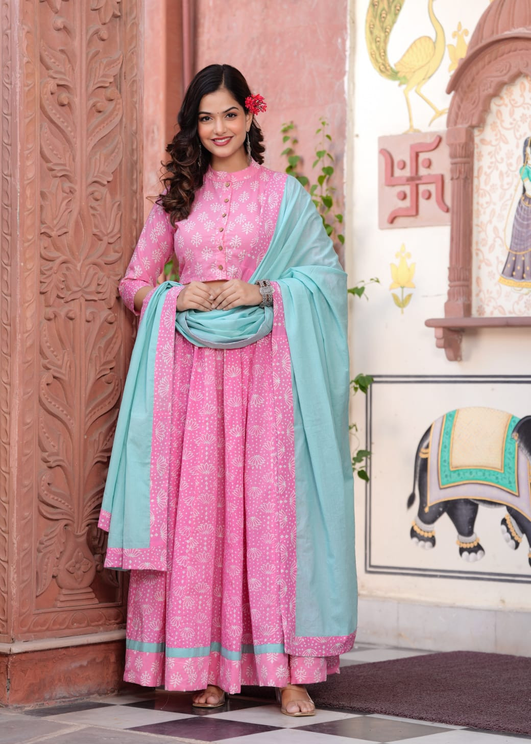 This elegant ethnic ensemble features a vibrant pink cotton lehenga and a matching crop top choli adorned with traditional floral block prints. The top is available in sizes ranging from 36 to 46 (S to 3XL) with a length of 15 to 16 inches, while the skirt stands 40 inches tall and boasts an impressive 5.5-meter flair created by its 28-kali construction. To complement the pink tones, the set includes a 2.5-meter sky blue dupatta finished with a matching pink printed border. Made from breathable cotton fabric, this outfit combines a massive flare with lightweight comfort, making it a perfect choice for festive occasions and daytime celebrations.