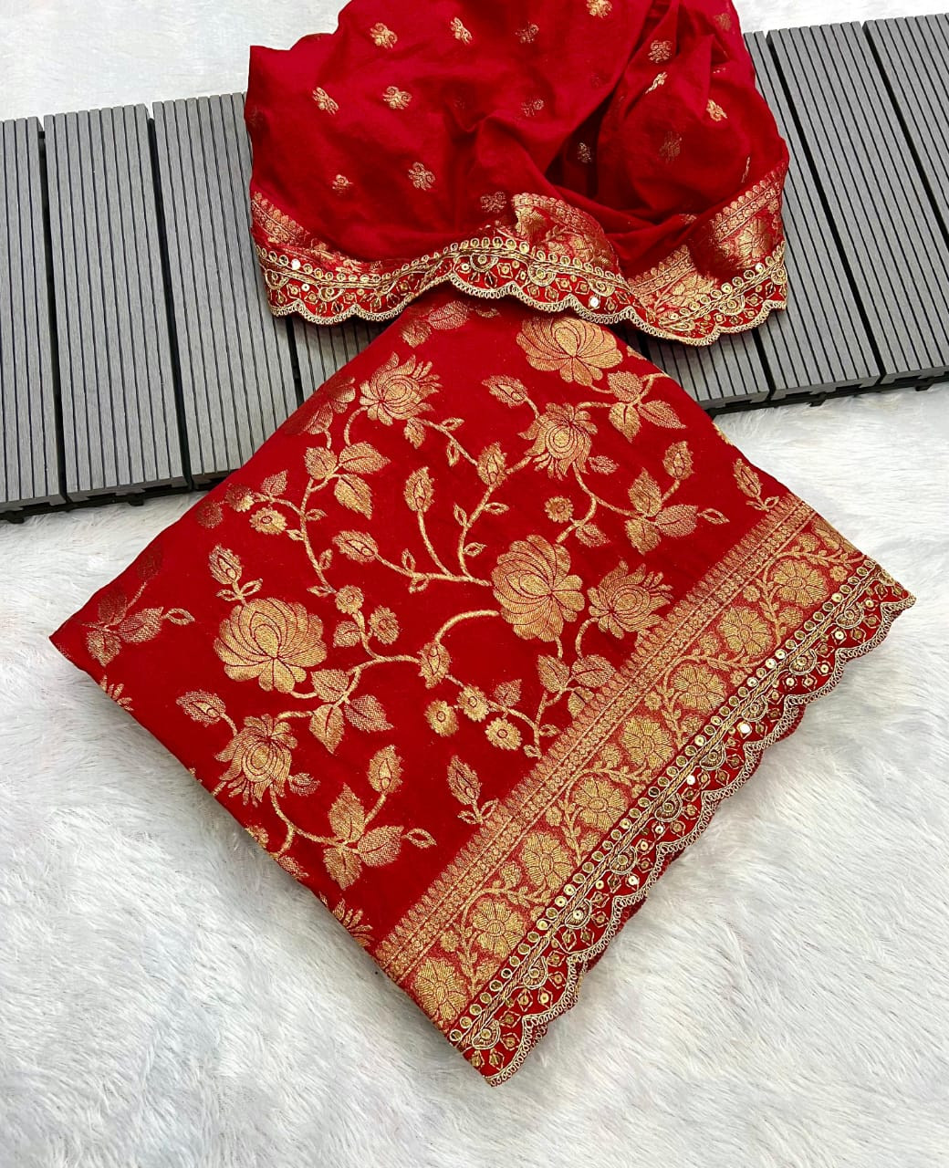 This ensemble features elegant, matching red and gold ethnic outfits for a mother and daughter, crafted from luxurious Khaddi Georgette material and adorned with a traditional floral brocade design. The vibrant red base is richly highlighted by intricate gold metallic (zari) thread work, creating a festive and opulent aesthetic. The use of Khaddi Georgette, known for its lightweight texture, exceptional soft drape, and subtle sheen, makes the outfits comfortable to wear while maintaining a sophisticated look. The design, often referred to as "flower jaal" or "bootidaar," showcases meticulously woven floral patterns across the entirety of the fabric, reflecting skilled Banarasi craftsmanship. The combination of the striking single color, rich gold work, and flowy material makes these outfits ideal for celebrations, weddings, and traditional events, offering both elegance and cultural charm