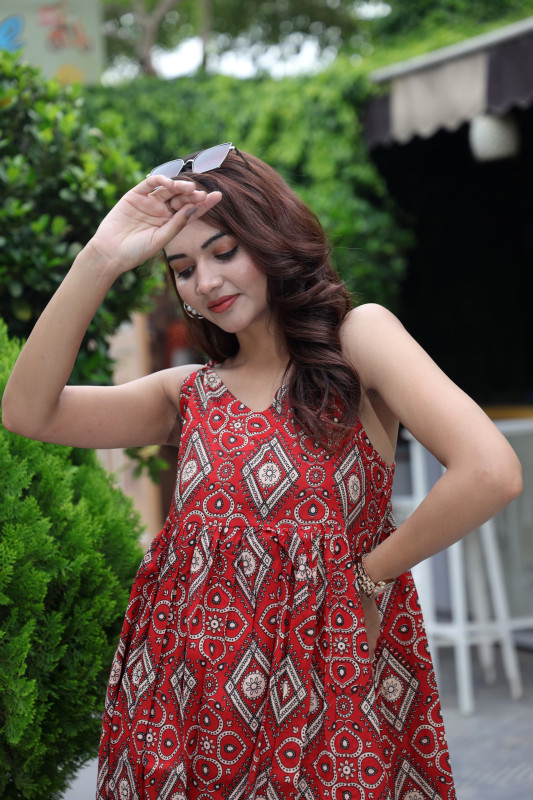 This vibrant one-piece dress is crafted from high-quality red cotton fabric and features an intricate all-over geometric diamond block print in earthy cream and black tones. The garment is designed with a sleeveless silhouette and a classic V-neckline that flows into a gathered waist, creating a comfortable and flattering A-line fit. Falling to a midi length, the dress offers a stylish and breathable option for casual outings, summer parties, or daytime social events. The soft cotton material ensures ease of movement while the traditional print provides a beautiful ethnic touch to a modern western silhouette. This versatile piece is easy to wear and can be perfectly paired with simple flats and minimal jewelry for a complete and polished look.