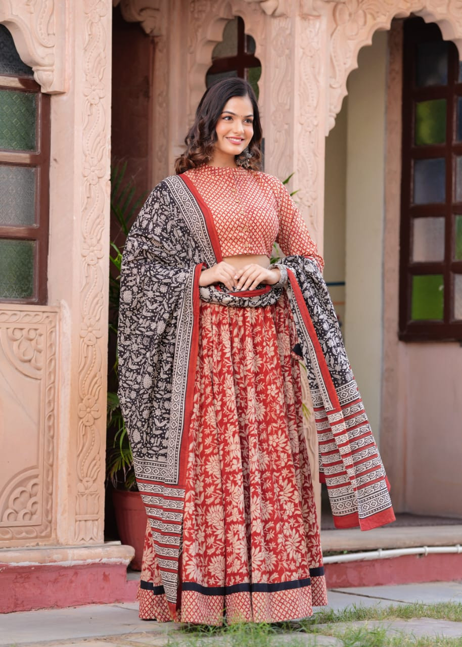 This exquisite ethnic set is crafted from premium cotton and features a traditional red floral Ajrakh block print across the lehenga and choli. The outfit includes a mandarin collar crop top choli with a button-down front, measuring 15 to 16 inches in length and available in sizes 36 to 46 (S to 3XL). The coordinating lehenga skirt is 40 inches long and is designed with 28 kalis to provide a grand 5.5-meter flair that creates an elegant drape. Adding a sophisticated contrast, the set comes with a 2.5-meter black dupatta featuring intricate botanical patterns and a matching red border. This breathable and stylish ensemble is a perfect choice for weddings, cultural festivals, or special evening occasions where you want to showcase traditional craftsmanship.
