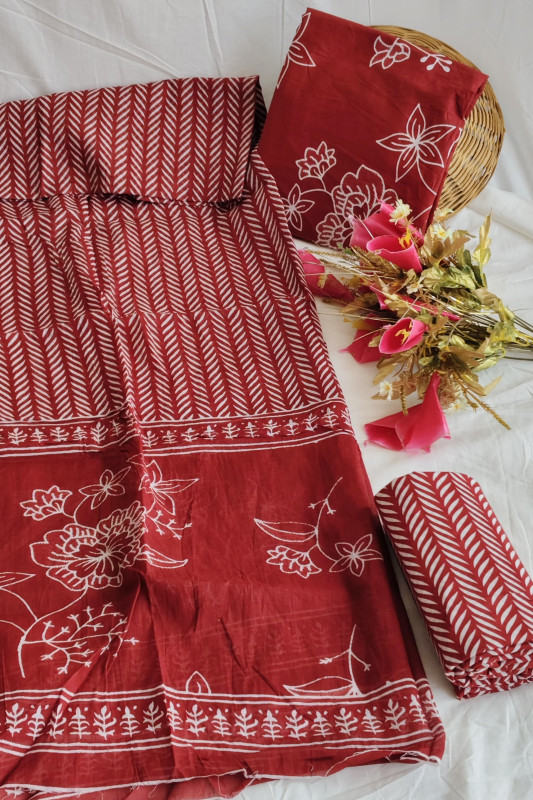 This exquisite unstitched suit set features a vibrant red base adorned with contrasting white motifs created using the traditional hand block printing technique. The design cleverly combines two distinct patterns: a dynamic chevron or leaf-like striped motif on the top and bottom fabrics, and elegant, detailed white floral motifs on the dupatta.