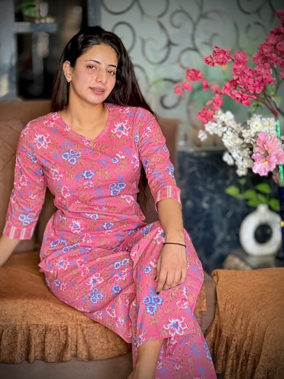 "Add a breath of fresh air to your wardrobe with this charming Rose Pink and Blue Floral Co-ord Set. Perfectly capturing a sweet and feminine vibe, this two-piece ensemble features a lovely salmon-pink base scattered with vibrant blue and white floral motifs that evoke the feeling of a blooming summer garden.