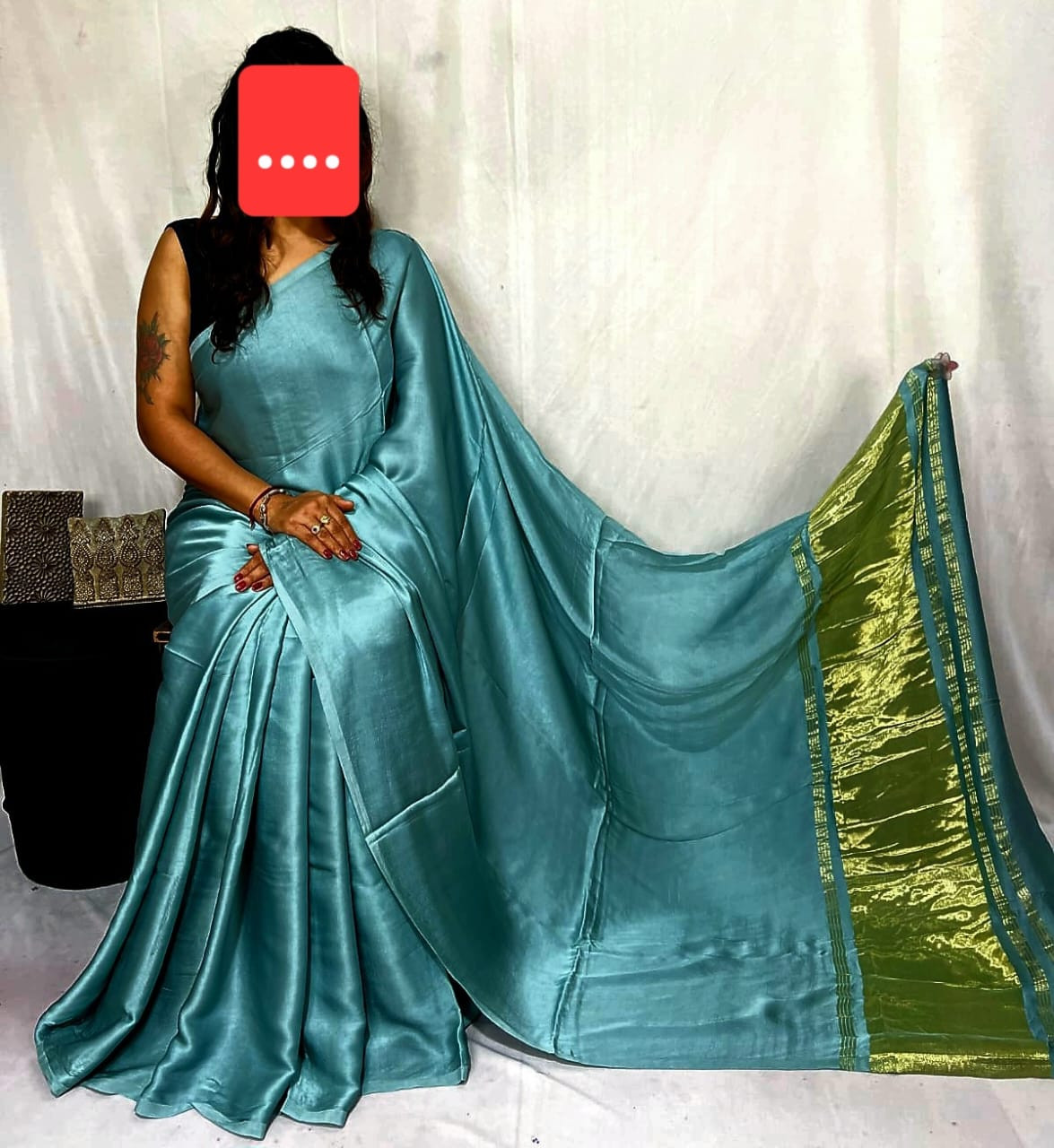 Expertly crafted from Premium Satin Modal Silk, this saree offers an exceptionally soft, buttery-smooth texture and a fluid drape that effortlessly contours to every silhouette. The mesmerizing Sea Green hue features a plain dyed finish that exudes a calm yet powerful aesthetic, making it a sophisticated choice for modern celebrations. Elevating the entire look is a Stunning Contrasting Golden Zari Border, which adds a brilliant metallic pop and a touch of traditional opulence to the sleek, glossy fabric.