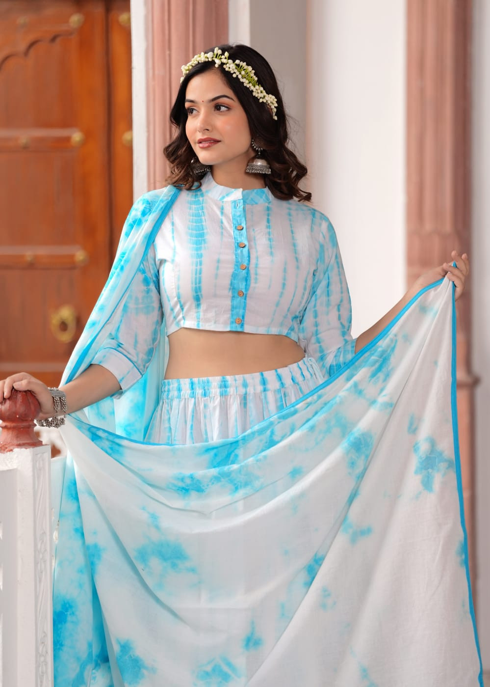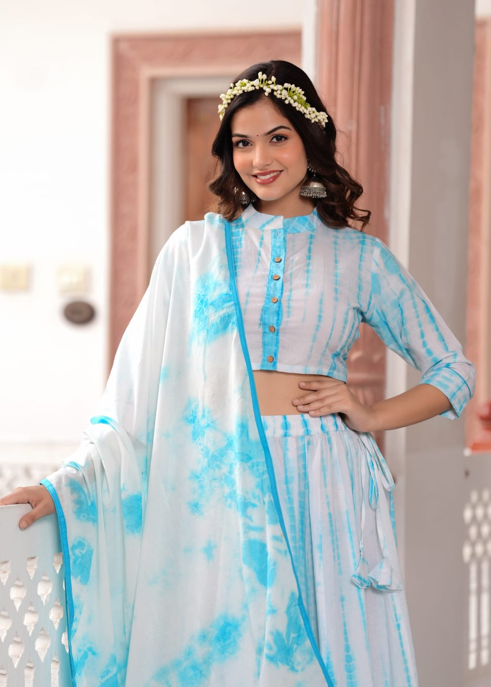This refreshing ethnic outfit features a serene sky blue and white shibori tie-dye pattern on high-quality cotton fabric. The set includes a button-down crop top choli with a mandarin collar, measuring 15 to 16 inches in length and available in sizes 36 to 46 (S to 3XL). The coordinating lehenga skirt is 40 inches long and is constructed with 28 kalis to create an expansive 5.5-meter flair that ensures a graceful silhouette. A 2.5-meter dupatta with a matching shibori print and thin blue borders completes this airy and vibrant look. Ideal for summer festivities or daytime events, this lightweight ensemble perfectly blends traditional dyeing techniques with a trendy and comfortable design.