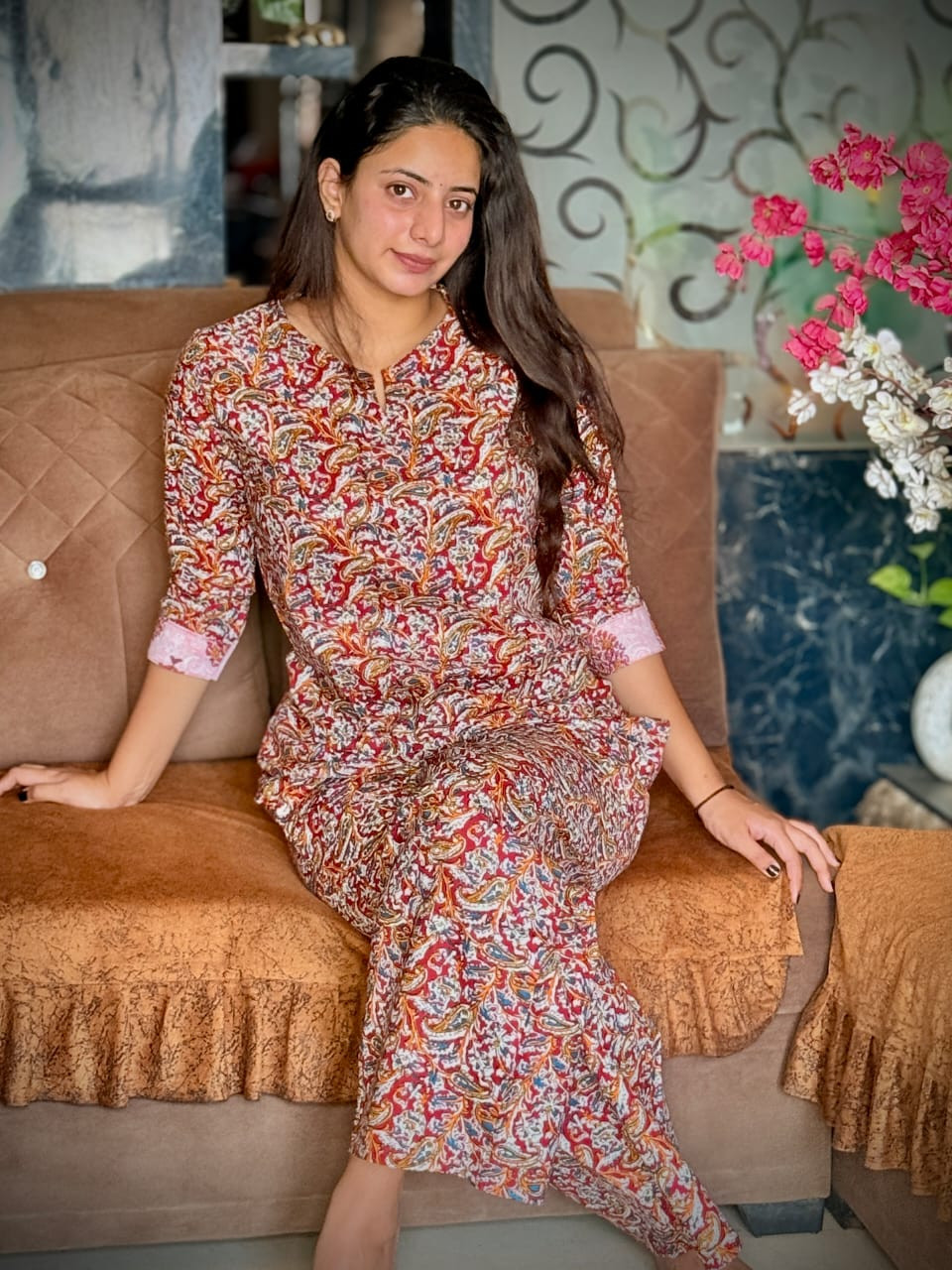 "Radiate warmth and ethnic charm with this stunning Crimson Red Paisley Co-ord Set. Designed for the woman who loves a splash of color, this two-piece ensemble features a rich, rustic red base densely packed with intricate paisley and floral motifs in contrasting shades of mustard yellow, teal, and ivory. The top is a relaxed-fit tunic with a comfortable notch neckline and three-quarter sleeves that are beautifully finished with a contrasting pink floral border at the cuffs, adding a unique and thoughtful detail to the design.
