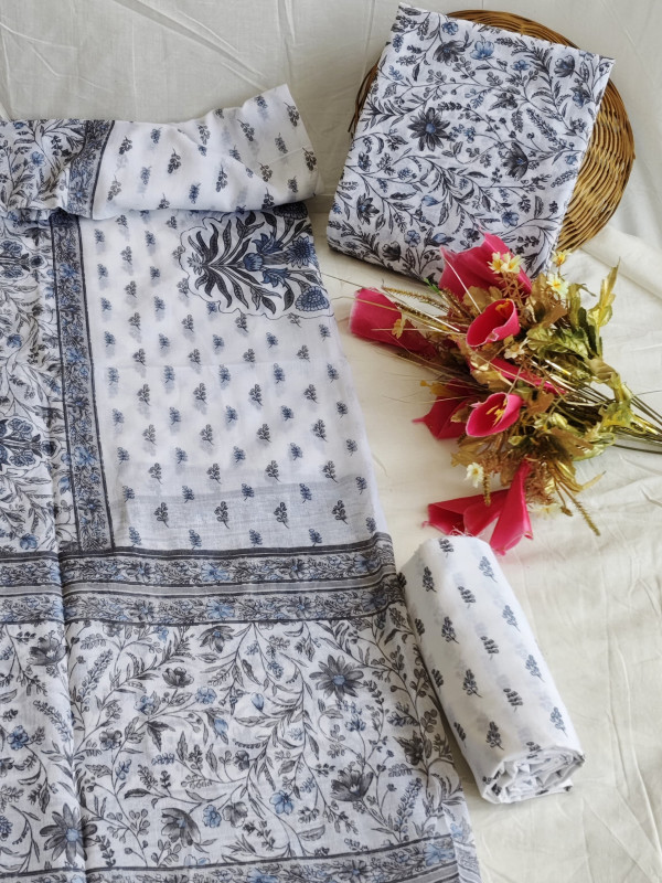 The design showcases the beauty of traditional Indian textiles, utilizing intricate hand block printing techniques to create detailed Sanganeri or Bagru-style motifs. The fabric intended for the kurta features dense floral and leafy patterns, primarily in grey/black outlines with occasional delicate blue accents. The accompanying dupatta complements this design with a richer, border-focused pattern that frames the ensemble perfectly. This versatile material allows the wearer to tailor the outfit into various styles, such as a classic salwar kameez, a contemporary straight-cut suit, or trousers with a tunic, ensuring a personalized fit and elegant finish