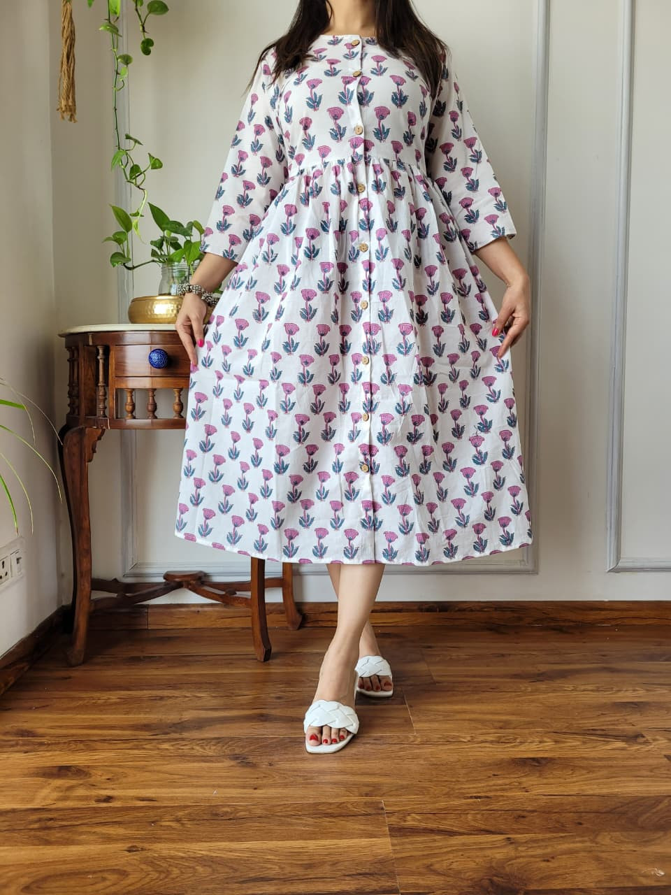 This white and pink floral hand block printed cotton A-line one piece dress is a charming and comfortable garment that effortlessly combines traditional Indian craftsmanship with a modern, flattering silhouette. Crafted from premium, breathable cotton cambric fabric, the dress offers a soft, lightweight feel, ensuring maximum comfort for all-day wear. The base color is a crisp white, adorned with intricate floral and botanical motifs in shades of pink and a subtle hint of blue/green for the leaves. These patterns are created using the time-honored hand block printing technique, a traditional artisan process that gives the garment an authentic, artisanal touch and connects it to the rich textile heritage of regions like Rajasthan. The design follows a flattering A-line silhouette, meaning it is fitted at the bodice and flares out gently toward the hem, providing graceful movement and a relaxed yet elegant fit. Key design details include a classic round neckline, a functional partial front button placket closure with contrast buttons, and three-quarter length sleeves. Many similar styles also incorporate convenient side pockets for added practicality. This versatile cotton dress is ideal for a variety of settings, from casual outings and brunches to office wear or evening gatherings, offering both elegance and ease.