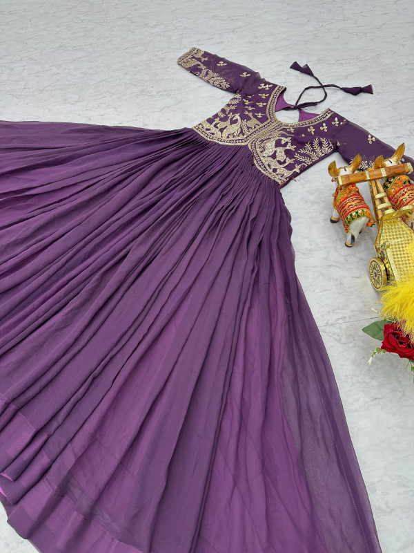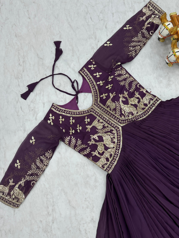 Wine Faux Georgette Embroidered and Sequins Work Designer Anarkali Gown, designed to make a lasting impression at any special occasion. The gown is crafted from premium-quality faux georgette fabric, known for its lightweight and ethereal drape that flows beautifully and moves gracefully with every step, lined with soft micro cotton for comfort. The rich, deep wine hue provides a sophisticated backdrop for the intricate craftsmanship, with the bodice and sleeves featuring detailed embroidery work with shimmering sequins and silver thread, strategically placed to catch the light and add a touch of glamour and luxury. The Anarkali silhouette boasts a generous flare, enhancing its regal look. This ensemble is a perfect choice for various events, including festive celebrations, weddings, receptions, and evening parties, and often comes complete with a matching faux georgette dupatta featuring coordinating work, ensuring you stand out with timeless beauty and grace