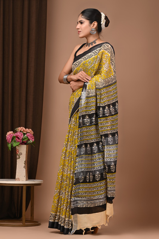 The saree is adorned with complex Hand Block Prints featuring Floral and Kalamkari style motifs, primarily in Black and Grey colors. These handmade prints create a splendid contrast against the bright yellow background, showcasing the artistry of traditional Indian printing techniques. These patterns often spread across the entire body of the saree.