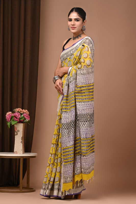 The saree is richly detailed with exquisite Hand Block Prints featuring Floral or Kalamkari Motifs predominantly in Black and White. These handcrafted motifs create a striking contrast against the bright yellow base, showcasing the artistry of traditional Indian printing techniques. The patterns often cover the body and are more densely concentrated on the pallu, which may include geometric lines and contrasting bands for visual interest.